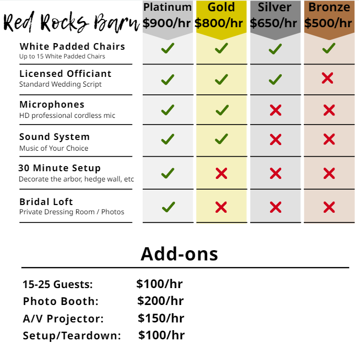 Pricing varies by date and options, but our elopements are positioned to be competitive for Colorado Springs. For exact numbers, you can book and schedule a tour right from this page and we’ll provide a current, itemized quote.
